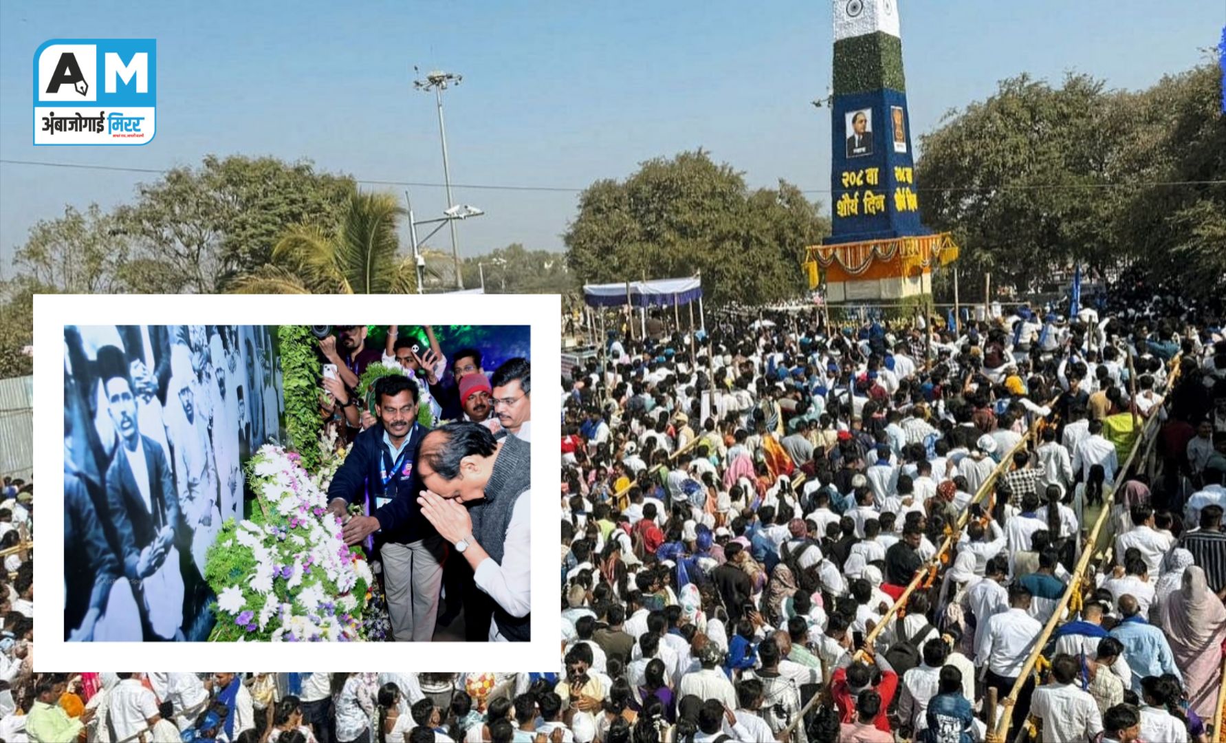टीम AM : कोरेगाव भीमा येथे 208 व्या शौर्यदिनानिमित्त ऐतिहासिक विजयस्तंभास अभिवादन करण्यासाठी हाती निळे झेंडे व मुखी ‘जय भीम’ ची गर्जना करीत लाखों भीम अनुयायांचा जनसागर उसळला. उत्साहपूर्ण वातावरणाने संपूर्ण विजयस्तंभ परिसर व अहिल्यानगर रस्ता गर्दीने अक्षरशः फुलून गेला होता. पहाटेपासून रात्री उशिरापर्यंत अभिवादनासाठी अखंड रांगा लागल्या होत्या.
